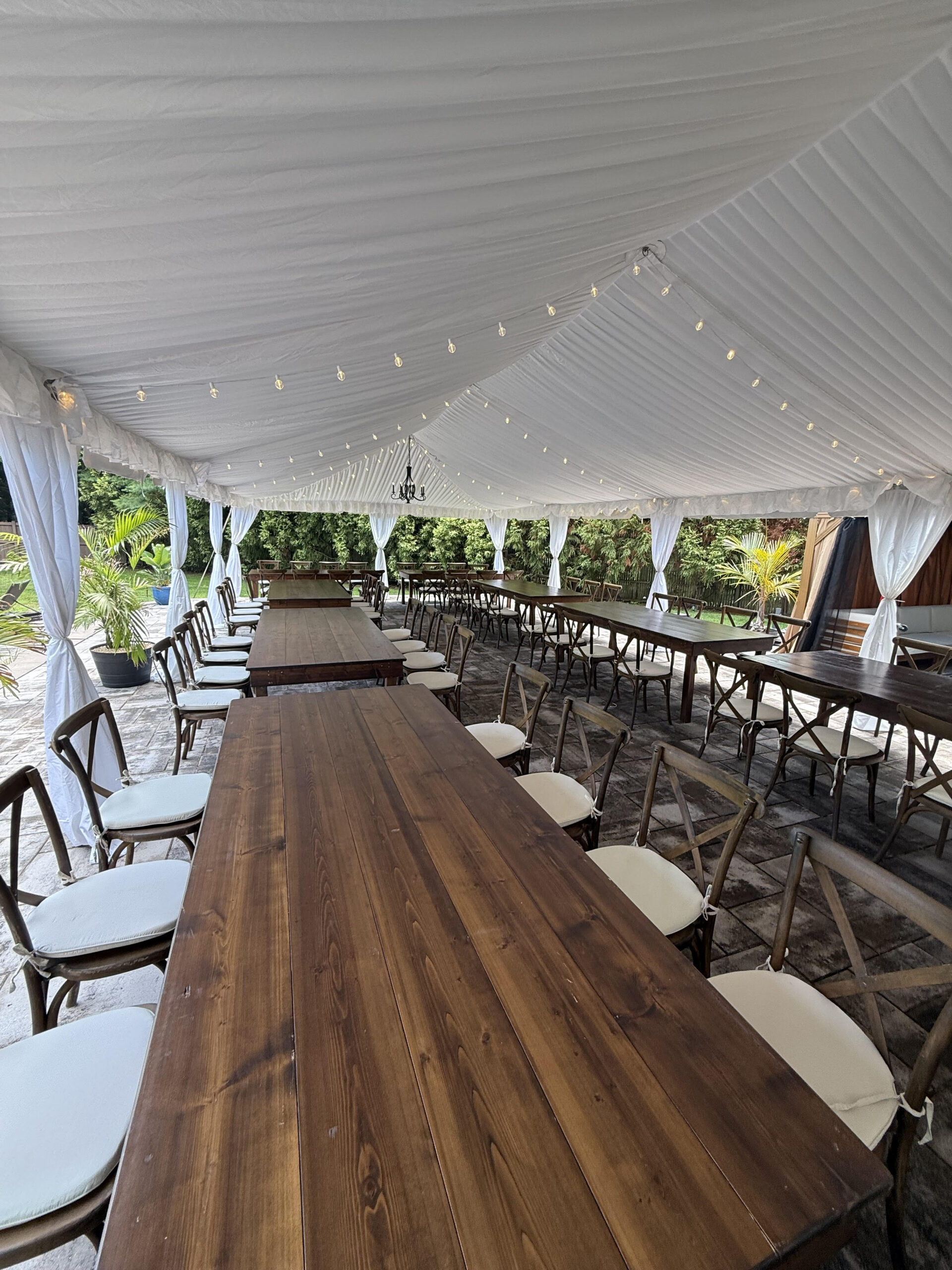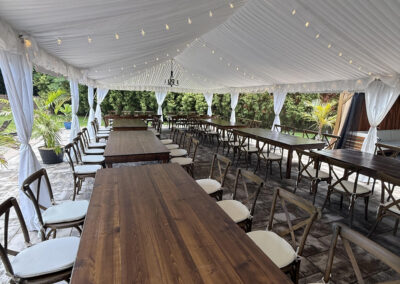 There are endless takes on the rustic theme, and the beauty of this trend is that you can make it as laid back and relaxed or as upscale as you wish! Our rustic tents encompass a mixture of our wooden farm tables, styled wooden chairs, and wine barrel bars. In addition, we also have rustic tent chandeliers and bistro lighting to complete the vibe!