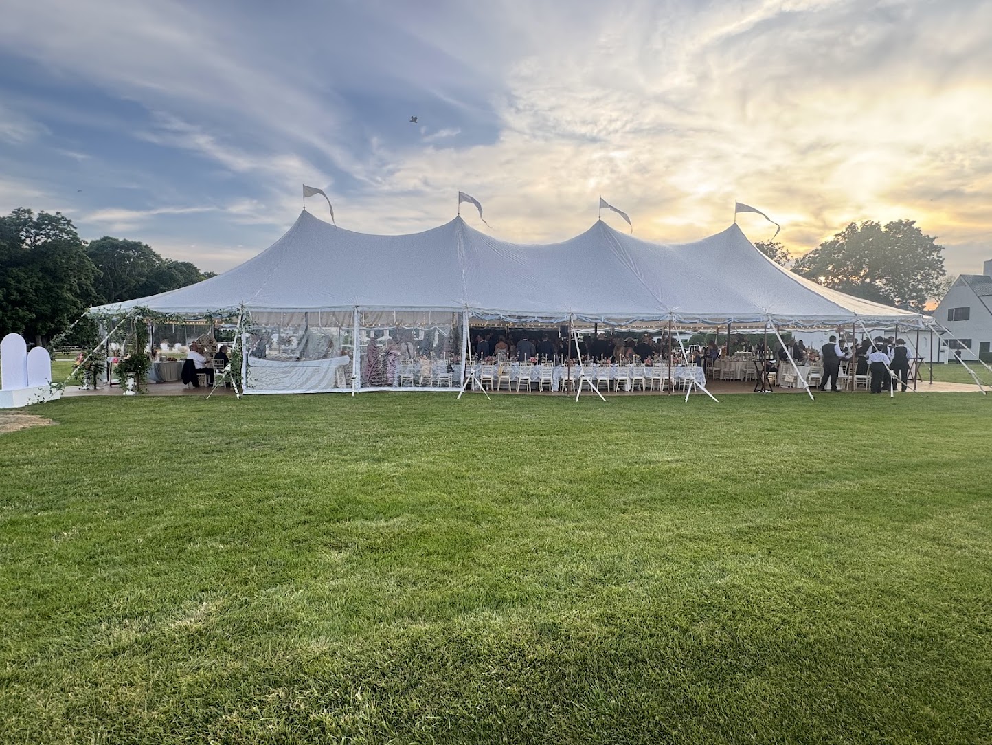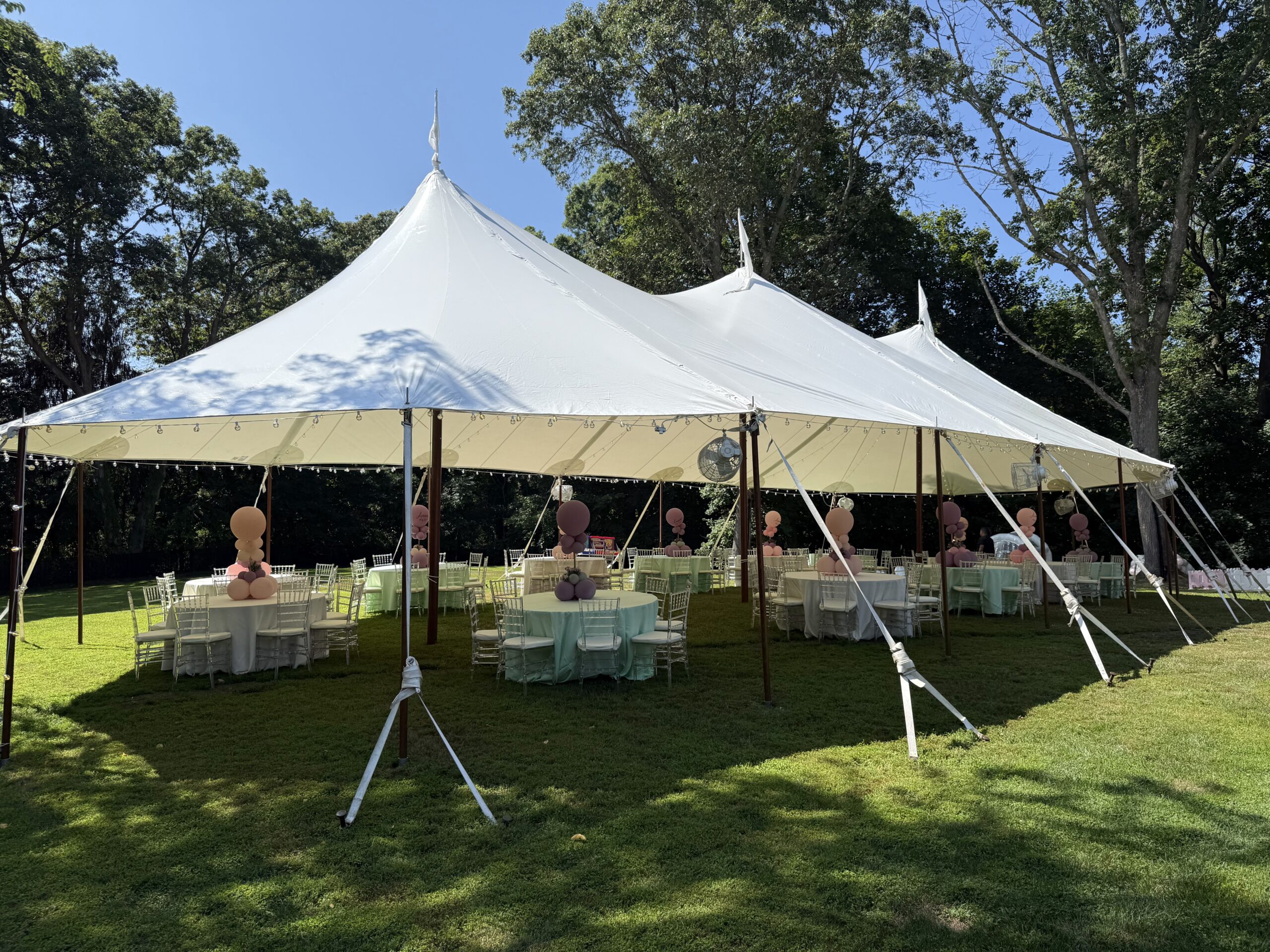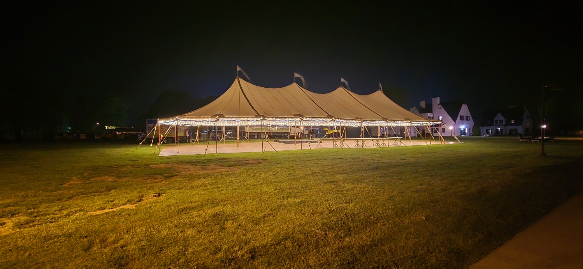 Sailcloth tents are tension-supported structures that require heavy-duty staking into the ground to maintain their shape and safety. They are best suited for flat, grassy areas or soft earth. If your venue is a hard surface, such as a parking lot or concrete patio, we typically recommend our frame tents or clear span structures, which can be safely secured with weighted ballasts rather than stakes.