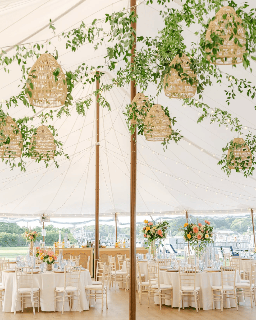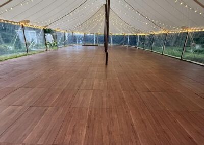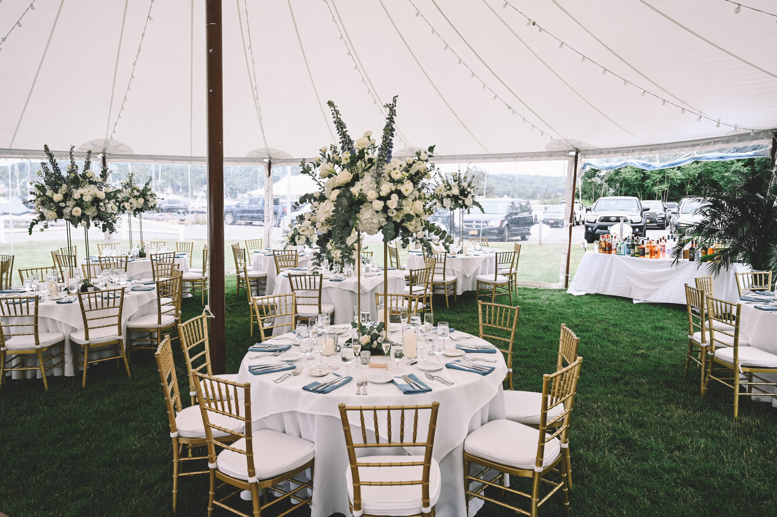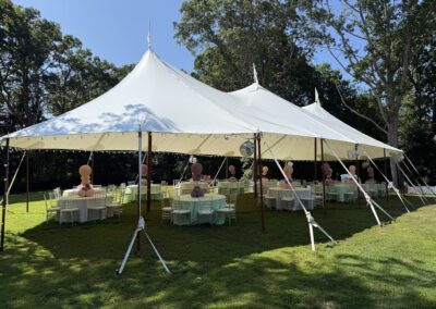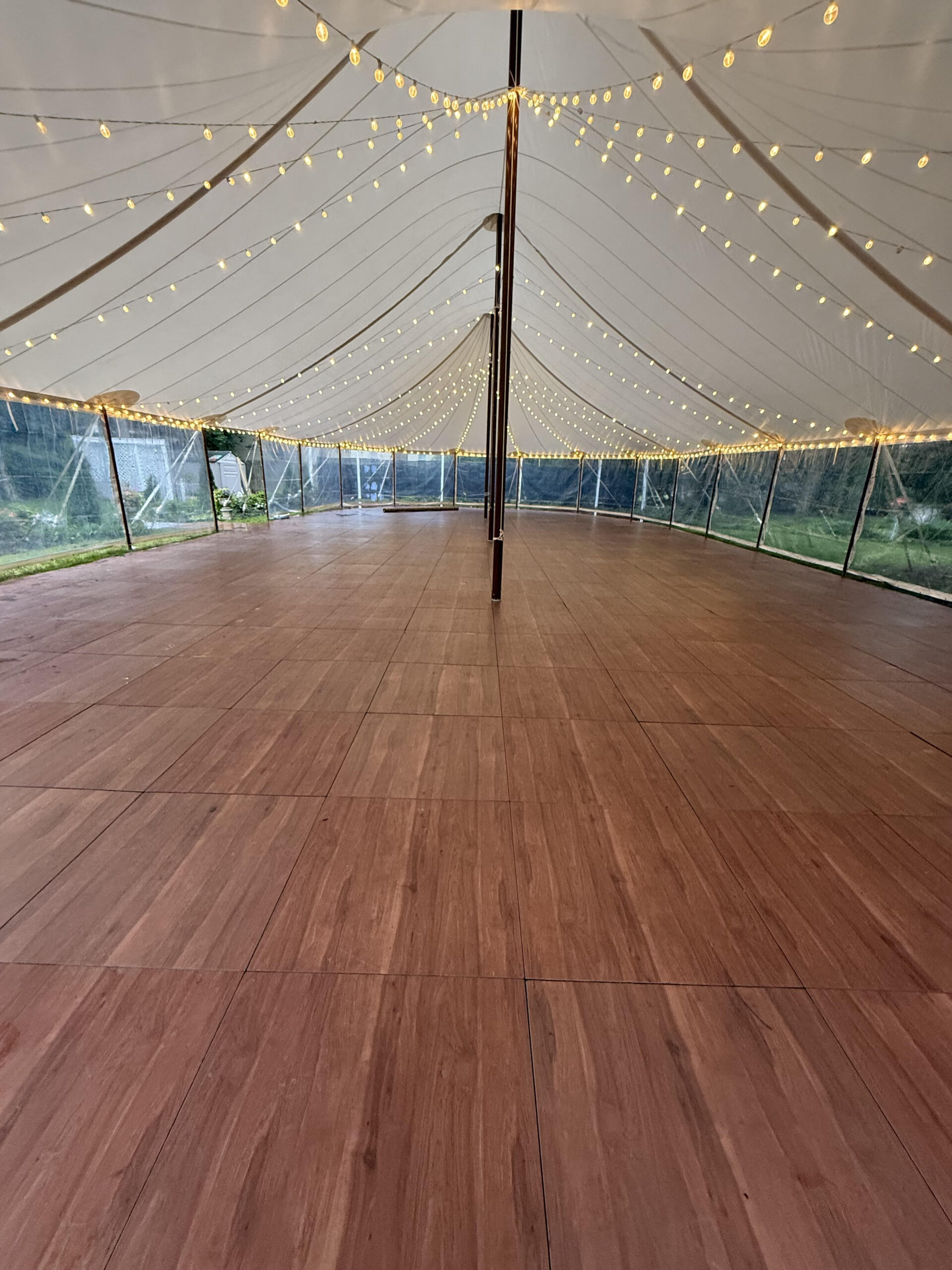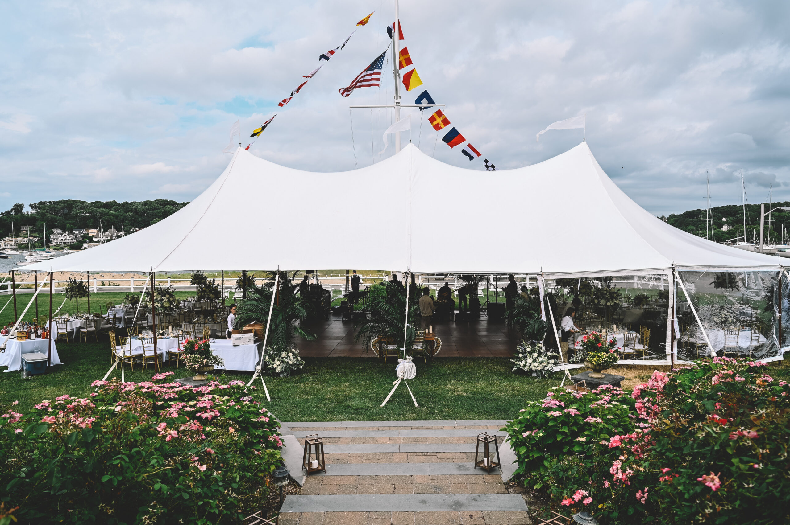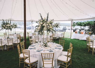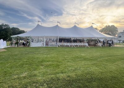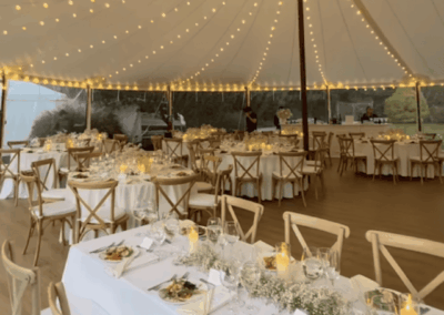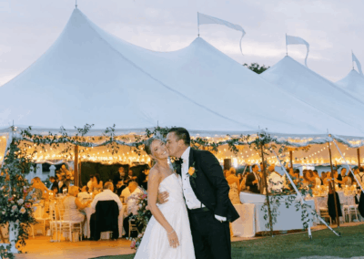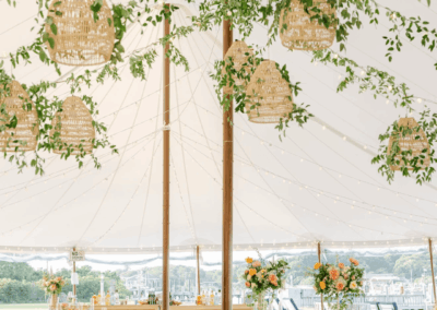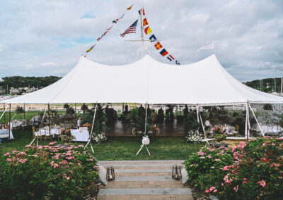 In a sailcloth tent, the center poles are fully structural and essential to the tent’s stability. Our poles feature a stained wood finish to enhance the nautical, organic feel of the design. When planning your floor plan and seating, our team will help you position the dance floor and tables around these poles to ensure a natural flow for your guests.