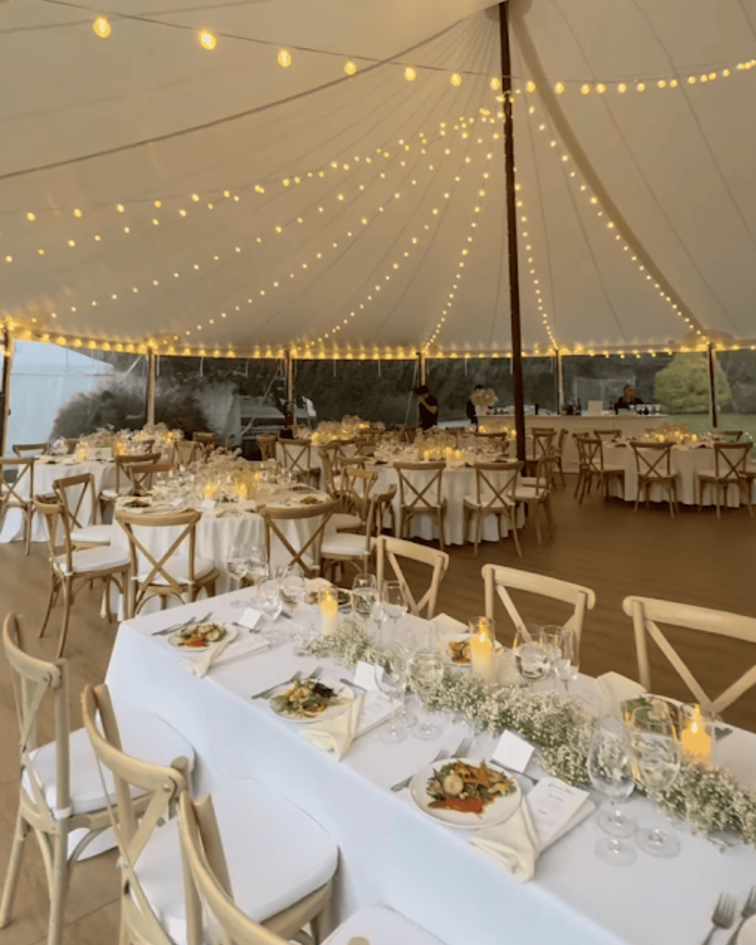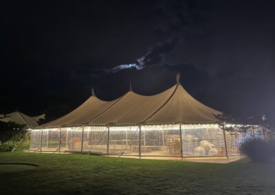 While both use center poles for support, a sailcloth tent is defined by its fabric and finishing. We use a genuine translucent sailcloth material that allows natural light to filter through during the day and creates a glowing effect at night. Unlike the heavy, vinyl look of standard tents, sailcloth features rounded ends, nautical wood-finish poles, and hand-stitched reinforcements, prioritizing a high-end, coastal aesthetic.